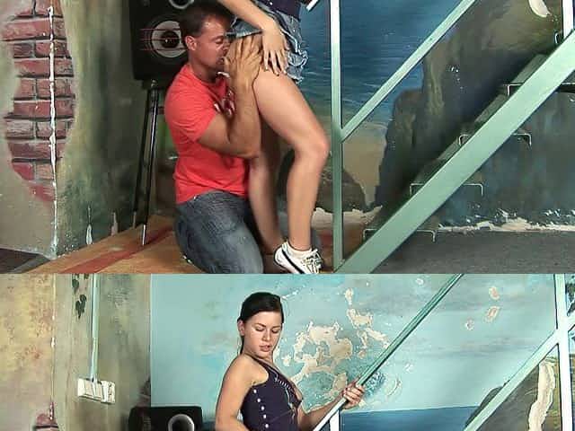 An old fart in glasses seduces his cute brunette college student in miniskirt