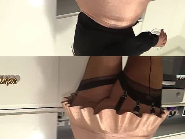 Seductive amateur MILF teasing in a tight mini-skirt, showcasing her visible panty line