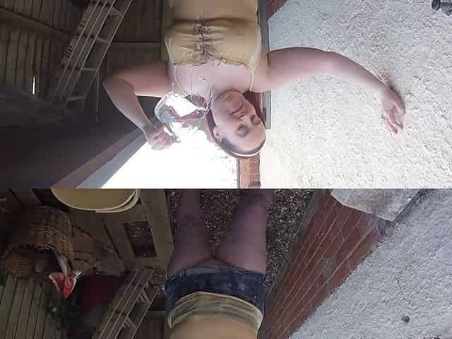 Wife flashing in Denim miniskirt in the yard