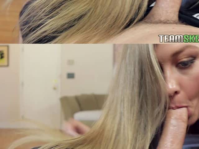 Long-haired blonde MILF wraps her mouth around a cock before riding the shaft