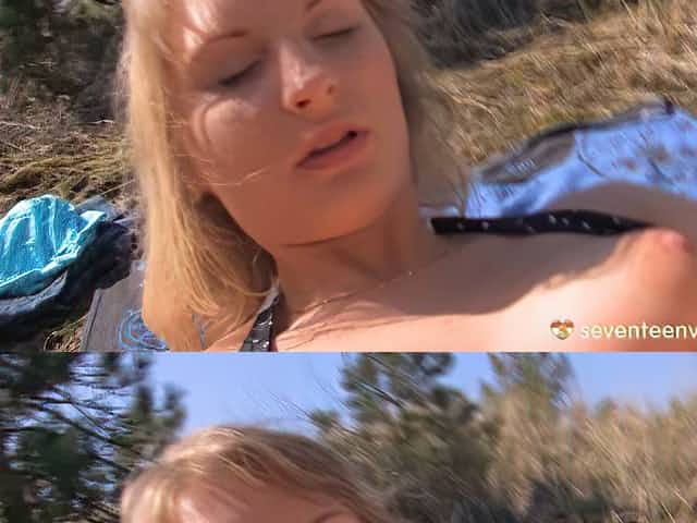 Lonely blonde teen reads book and plays with her tits in the forest