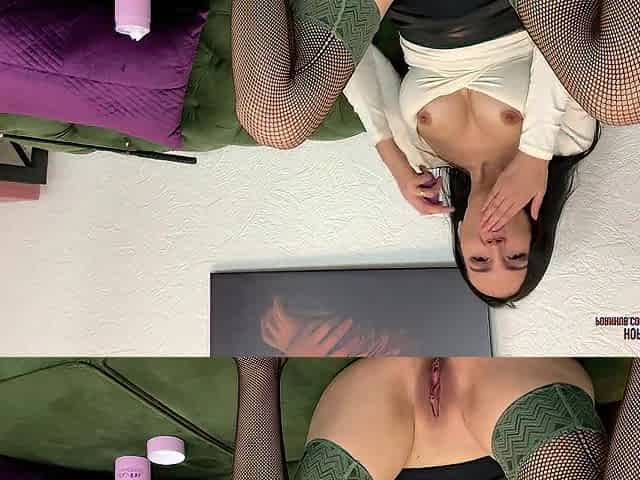 A girl Rides Dildo - Anal Plug, Ripped Tights, Mini Skirt