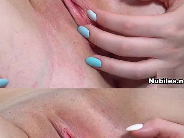 Big-boobed blonde Ariela Donovan is touching her shaved pussy