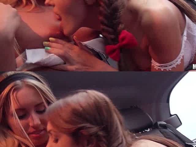 Depraved college girls share a cock in a car in hardcore FFM video