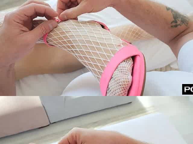 Ruby Mae wearing nylon stockings watching her boss jerk off