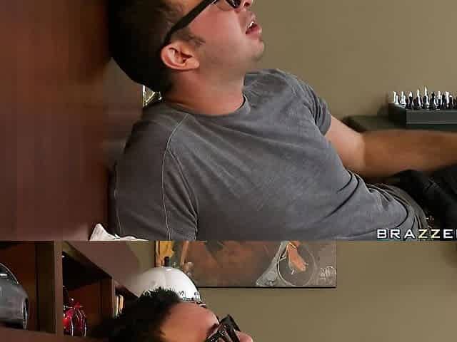 Secretary in glasses Dava Foxx is enjoying interracial dick-riding so much