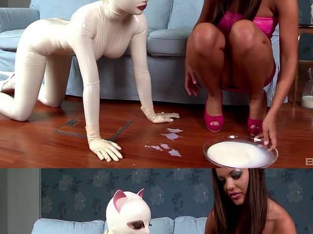 Mistress makes her sex slave eat on the floor and lick her heels