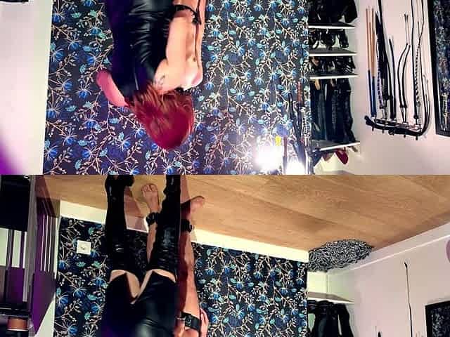 Miss Alessa Milano in leather bondage with cross and intense cock and ball torture by strict femdom mistress