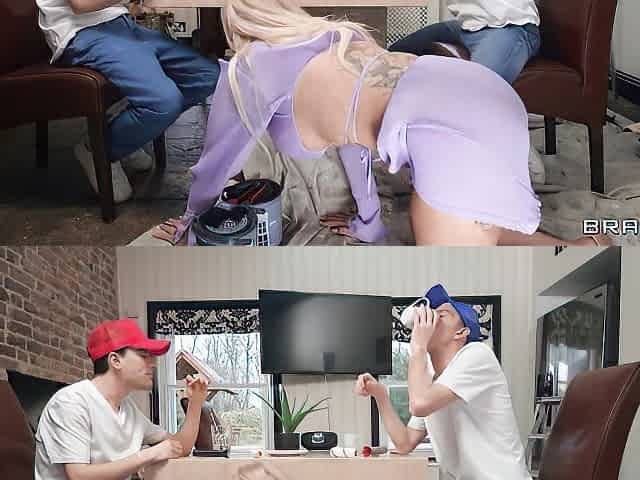 Foxy blonde Eva Barbie undressed and fucked by two horny guys