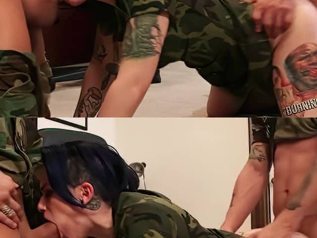Tattooed hussy gets drilled after giving blowjob to a duo of dudes
