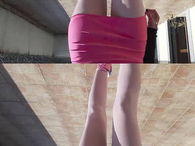 Laura on Heels model step sister has to walk on platform pink heels, hose and a microskirt