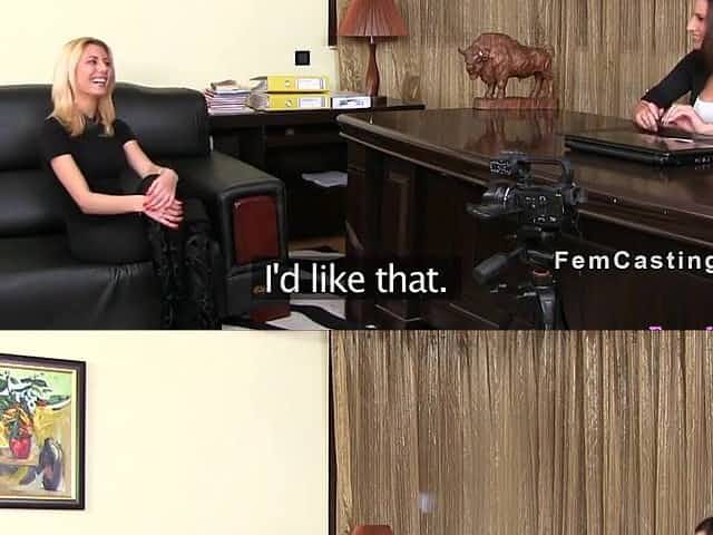Small blond model licks giant titties female agent