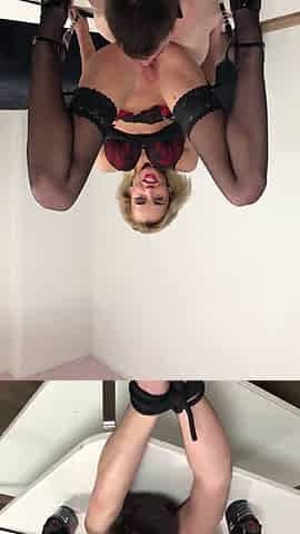 Muscle mama dominates sub with giant bad dragon. His butt can’t stop cumming