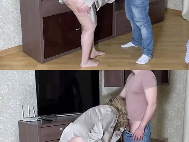 Old mother I'd like to fuck with large breasts and butt has joy in the kitchen with her boyfriend