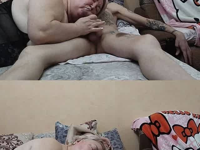 Mother-in-law Licks My Swollen Balls and I Jerk off My Cock and Cum in Her Mouth and on Her Face