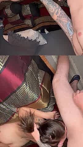 "Step mom blowjob and handjob step son thick cock in bed"