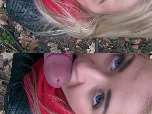 Pretty looking brunette slut sucks kinky man off outdoors for money