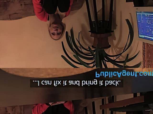 DEBT4k. Junger Schuldeneintreiber wirft der rothaarigen Kellnerin ein Bein zu