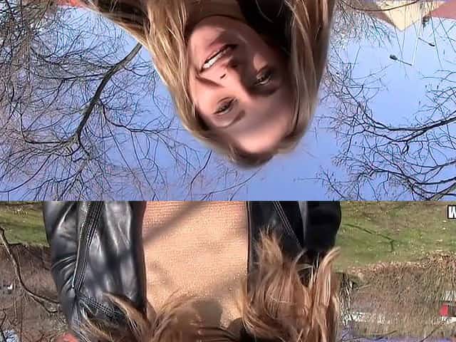 Busty blonde bangs outdoors pov for money