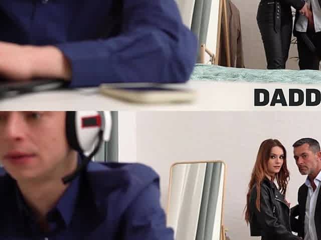 Naughty young brunette cheats on her boyfriend with his dad while he is working