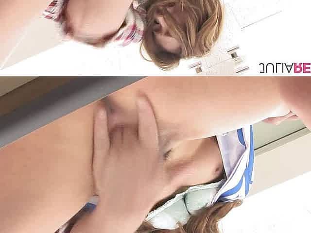 Very beautiful busty teen with short blonde hair gets fingered and rides a monster cock.