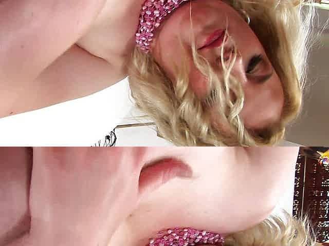 Mega busty Angela in a sexy red satin outfit playing with her self