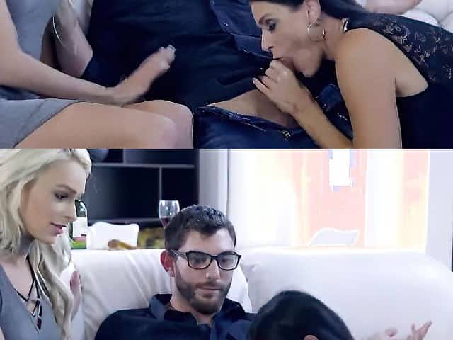 Two elegant ladies are using the single man's shaft in threesome intercourse