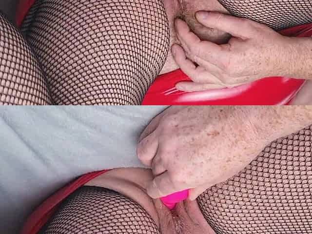 Vibrator in Hary Pussy to Loud Orgasm in kinky red PVC dress squeezing huge milker mommy tits