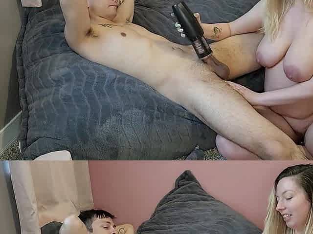Muscle mama dominates sub with giant bad dragon. His butt can’t stop cumming