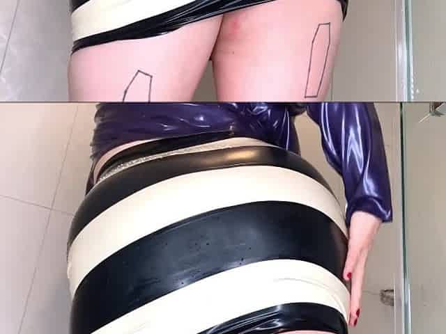 Latex in the Shower Metallic Purple Coat and Striped Black and White Mini Skirt