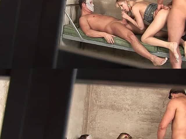 Young Babe Masturbating Behind Bars And Two Muscular Guy's Banged Her