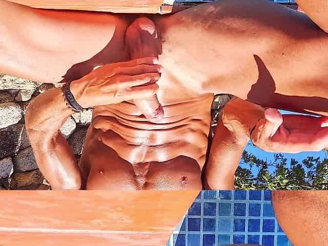 Hot chap applying suntan oil to his stripped body in a public pool - risky ejaculation