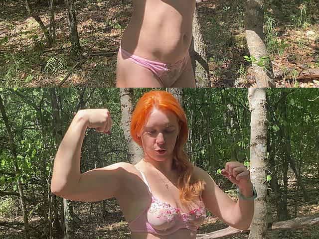 Sexy Redhead Strong Woman Showing Her Big Muscles in the Forest, Face Included in the Video