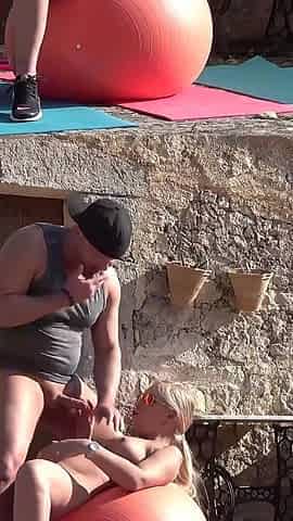 Outdoor Exercise Ball Gangbang with Dripping Creampie Overload