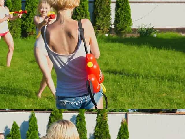A favourable man gets the one and the other angels to suck him off in the pool in the backyard