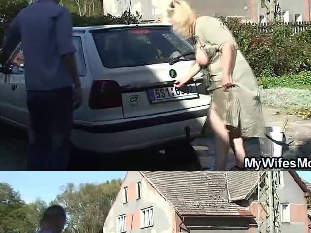 Bulky golden-haired woman lets her neighbour bang her brains out, whilst her spouse is at work