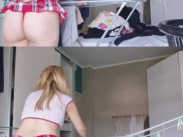 Sexually excited blond arranges her garments with the window open and the neighbour outside sees her exposed