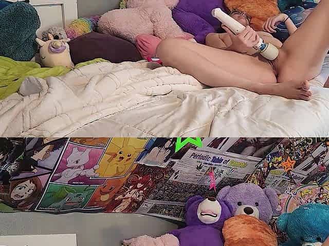 Nerdy gamer babe smokes cigarette while gaming nude, then squirts everywhere