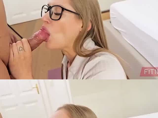 Nerdy blond chick with large, ebony glasses, Tiffany Tatum is having hardcore sex in her bedroom