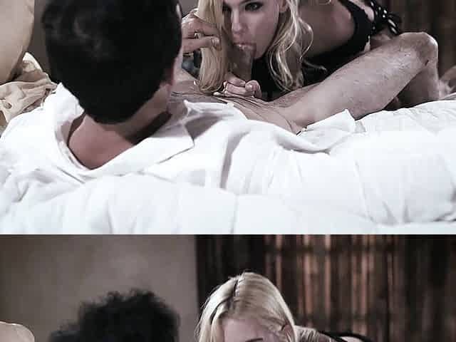 Busty brunette sluts sharing nerdy man's dick at casting trio