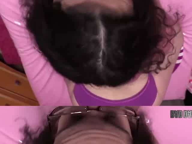 Nerdy beauty with glasses is sucking a large, ebony weenie to make her lover explode from enjoyment