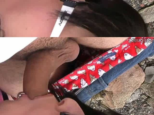 Nerd Brunette Blowjob and cumming beside beach