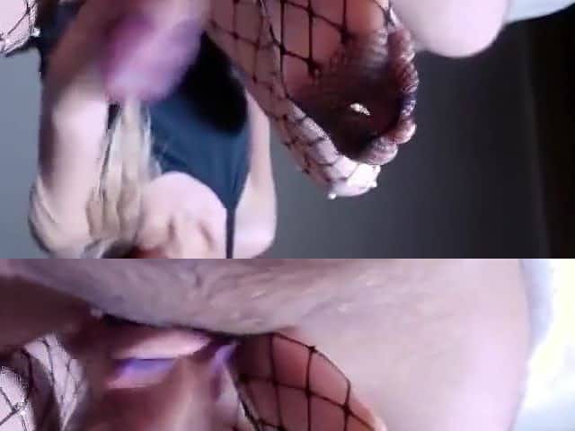 Nerd girl in fishnets sucks dick and does footjob