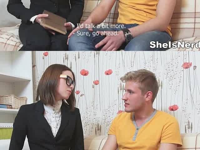 Young cute nerd gives blowjob and gets boned deep and hard