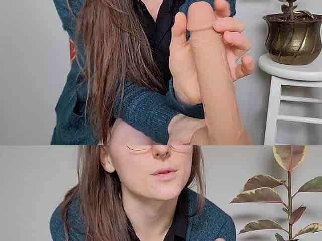 Nerdy Babe In A Bodysuit Gives A Footjob And Touches Herself