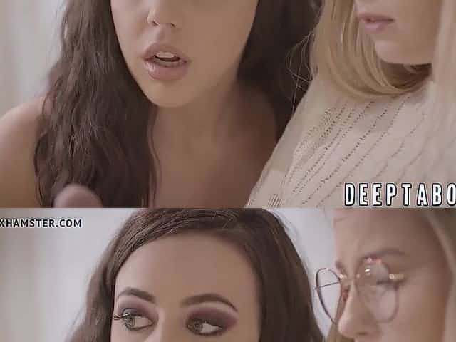 Nerd teen April Oneil and busty milf Vanilla Deville threesome