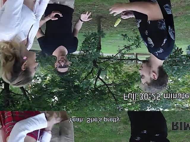 Nerdy teen works friend's cock with tongue and ass in campside sex