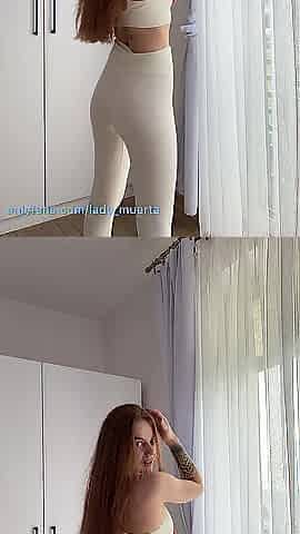 Photoshoot with Hazel Ash modeling a shiney button down with yoga panties / leggings