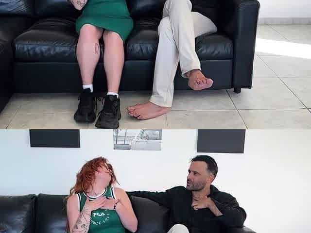 Busty curly brunette with big boobs fucks on couch