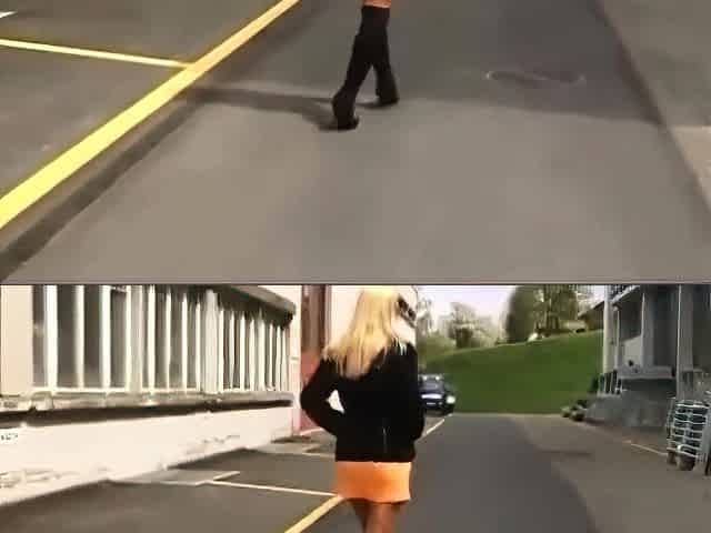 Beauty pees on hood of SUV during the time that squatting